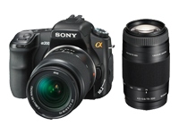 Set your creativity free. The Sony a (alpha) DSLR-A200 camera is poised to welcome you into the exciting world of DSLR performance. A DT 18-70mm and a 75-300mm lenses are included here, as well as superb 10.2-megapixel imaging, high-sensitivity shooting, and Super SteadyShot in-camera image stabilization that reduces blur with a brilliant array of Sony, Carl Zeiss and Minolta a-mount lenses. It's also fast, lightweight and incredibly easy to operate, with a large 2.7" LCD screen, simple Function Guide menu display and Creative Style settings to fine-tune camera performance. The powerful Bionz processing engine is also included to increase response time.Superb image quality gives you great DSLR shots right from the start, with a large APS-size CCD imager developed by Sony to expand dynamic range, minimize noise more effectively and provide greater detail for making big prints or cropping in tight on your subject.Broad sensitivity range from ISO 100 to ISO 3200 enables the ± (alpha) DSLR-A200 to capture beautiful color images even in very dim light - with High ISO Noise Reduction technology that reduces picture noise artifacts at high-sensitivity ISO 1600 and ISO 3200 settings by eliminating noise from RAW data after analog-to-digital conversion.A high-performance sensor detects vibrations and the image stabilization system automatically compensates. Because image stabilization is built into the ± (alpha) DSLR-A200, every lens benefits - and with an advantage of from 2.5 to 3.5 stops, you can shoot effectively at higher shutter speeds even in very low light with minimum blur from shaky hands or fast-moving subjects.The "brain" of the ± (Alpha) DSLR-A200 is the advanced Sony Bionz Image Processor, using hardware-based Large Scale Integrated (LSI) circuitry to enhance images with rich tonal reproduction, improved white balance and exposure control, and expanded D-Range Optimizer capabilities. With 2-channel data transfer from CCD to processor, your camera can also respond faster.To improve results with backlit subjects and recover details hidden in shadows or lost in glare, the ± (alpha) DSLR-A200 provides Dynamic Range Optimizer at two levels: Normal DRO, to improve detail using standard gamma curves for fast shot-to-shot response time, or Advanced DRO, to adjust dynamic range area-by-area for the greatest precision.Changing lenses in a DSLR can allow dust to enter the camera - so to keep the CCD imager cleaner for better pictures, the ± (alpha) DSLR-A200 utilizes both static-free anti-dust coating on the CCD filter and anti-dust vibration that automatically shakes the CCD to dislodge dust each time the camera is shut off.In Auto or some scene selection modes, the camera flash automatically pops up and fires when needed to help you shoot more effectively. Flash is cancelled in Landscape, Sport or Sunset modes and in "Flash Off" position on the Exposure Mode dial.Eye-Start Autofocus System begins precision autofocus adjustments the moment you raise the camera to your eye - so unlike some DSLR cameras that don't start focusing until the shutter button is half-pressed, the Sony ± (alpha) DSLR-A200 never slows down your ability to catch fast action.A fast focus motor and improved focus control help bring images into sharp definition more quickly, with predictive focus control that automatically calculates the position of a fast-moving subject.A 40-segment honeycomb sensing system provides multi-pattern measuring for superior exposure control accuracy - and you can also select center-weighted or spot metering modes. You'll also have 6 preset White Balance control settings and RGB Histogram display to check color balance.Along with auto exposure, the ± (alpha) DSLR-A200 gives you scene selection modes to optimize camera performance for Portrait, Landscape, Macro, Sports, Sunset and Night Portrait/Night View situations.To express your creativity and personal taste, you can adjust contrast, saturation and sharpness settings for any of 8 finishing styles - including Standard, Vivid, Portrait, Landscape, Night View, Sunset, B & W and Adobe RGB modes.A large built-in screen with anti-reflective coating makes it easy to read camera setup menus even in bright sunlight and improves image quality when you check your shots.To quickly review your photos, the ± (alpha) DSLR-A200 can display 4, 9 or 25-frame index views - or present automatic slide shows with fade-in/fade-out effect.The ± (alpha) DSLR-A200 can also create high-resolution thumbnail images for viewing on a Sony BRAVIA HDTV in optimized PhotoTV HD mode, with image format adjustable for standard 3:2 or widescreen 16:9 display.On-screen menus are intuitive and easy to use - and a simple Camera Function Display can be activated and operated with one hand using the Fn (Function) button and controller button to adjust Flash mode, Autofocus mode, White Balance, Metering mode, AF area and D-Range Optimizer.To capture action more effectively, the ± (alpha) DSLR-A200 offers continuous JPEG shooting up to the limit of your flash memory card - plus RAW Burst Mode (up to 6 shots) with intelligent buffer management to allow more shots to be captured without waiting for the buffer to clear.You can take up to 750 shots on a fully charged NP-FM500H InfoLITHIUM battery - and you'll be able to see about how much power remains in percentage increments, so you can keep shooting in confidence.For conveniently storing and sharing your images, the ± (alpha) DSLR-A200 accepts CompactFlash Type I/II media and Memory Stick PRO Duo media via an optional adaptor.The Sony ± (alpha) system gives you everything you need to expand your creativity in DSLR photography: precision Sony DT zoom lenses and specialty lenses, Sony "G" Series lenses with advanced motorized autofocusing, amazingly bright Carl Zeiss T coated lenses, professional-quality flash units, and over 16 million Minolta a-mount lenses sold worldwide.| Product Description | Sony a (alpha) DSLR-A200W - d